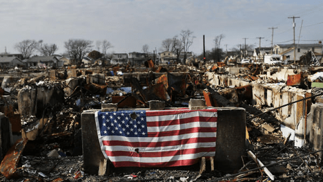 The image I have chosen to analyze is a photo of a neighborhood in Queens, New York in December, after the superstorm Hurricane Sandy devastated most of the east coast. The first thing you see when looking at the photo, is an American flag covering a piece of debris while everything else in the background is destroyed by either the hurricane or demolished due to damages that were to sever to repair. Further in the background, the debris and rubble left by Sandy are also surrounded by homes and vehicles of another neighborhood that were fortunate enough to survive the damages and demolition caused by hurricane Sandy. This photo was also used as a header for an article written in 2013 about the politics of disaster aid in America.